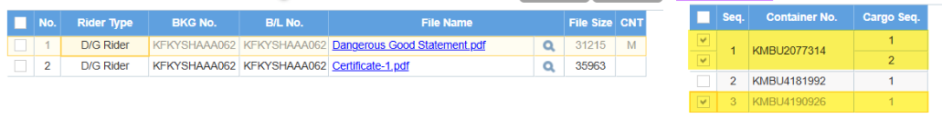 危険品における添付ファイルはe-ServiceまたはALLEGROでのBooking作成において添付することが可能です。