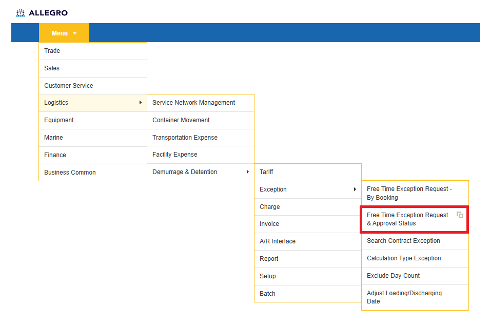 ・Free Time Exception Request & Approval Status画面より、申請の承認状態が確認可能です。御社が延長申請を行われている場合、この画面より申請状況が確認可能です。