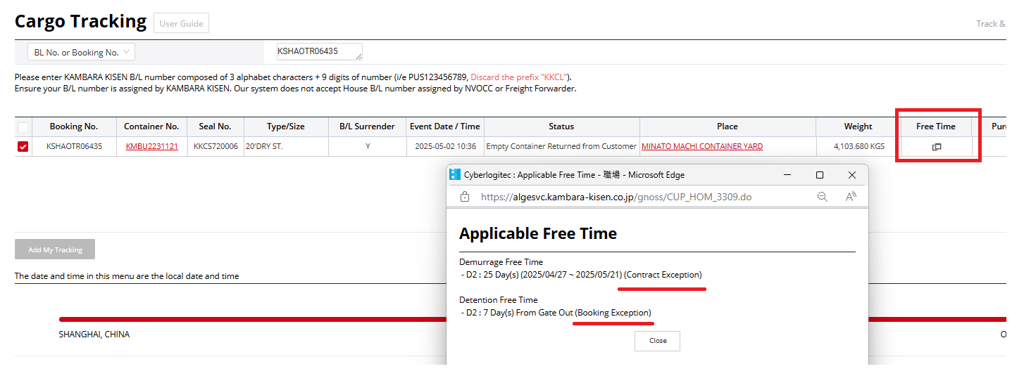- Booking Exceptionと表示されいる場合、船積み後に特例としてフリータイムが延長された事を示しています。