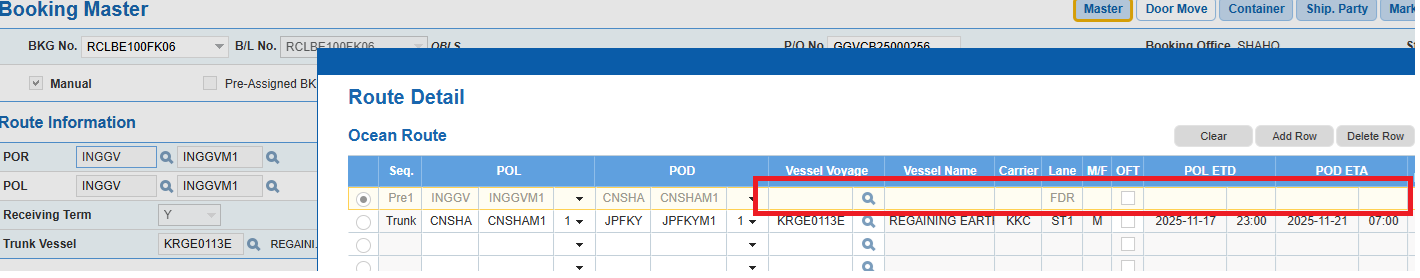 対象のBooking番号をBooking Master画面で確認いただき、以下のように接続船の情報が空白である場合、弊社中国操作部に登録を依頼頂きますようお願い致します。