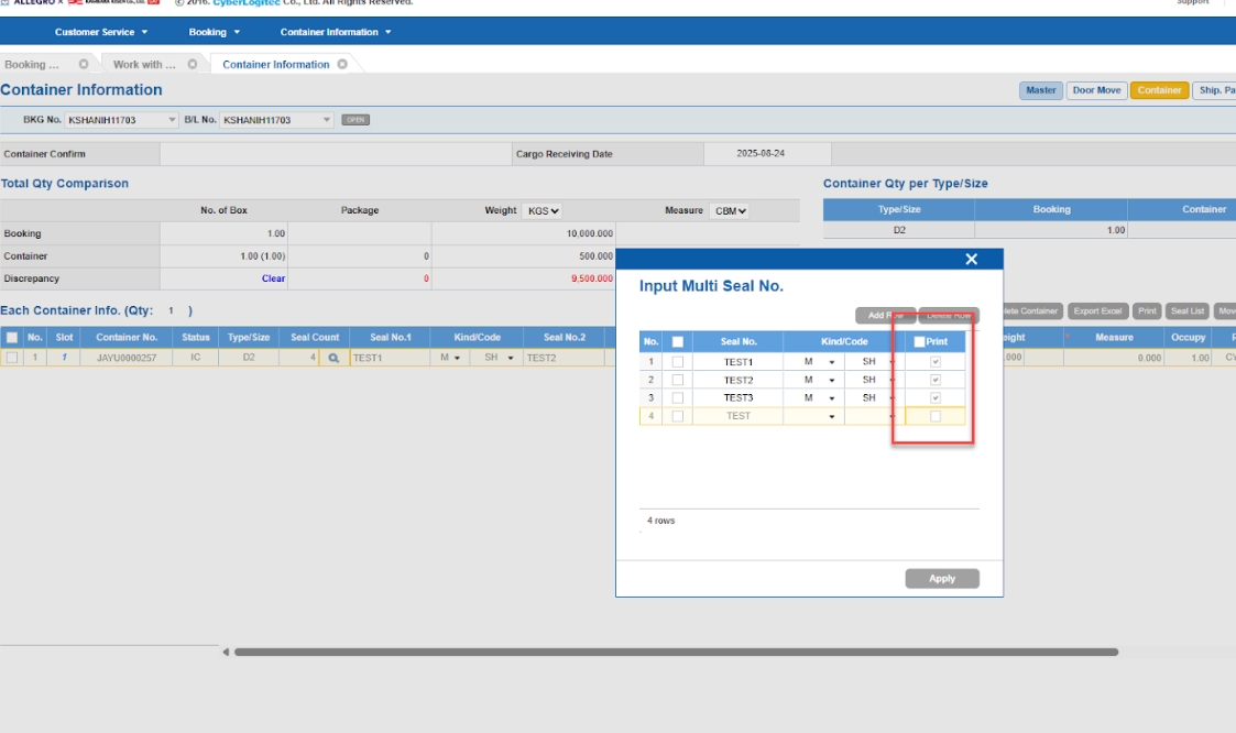 一つのコンテナに設定されておりますシール番号が3以上登録されたい場合、現状、コンテナシール番号を入力いただく経路(Find e-Booking & Shipping Request画面内 e-Service、Simple S/I、EDI)において、入力桁数(1~3件)に制限がございますので、それを超える入力を行われたい場合、Container Information画面より手動での設定をお願い申し上げます。