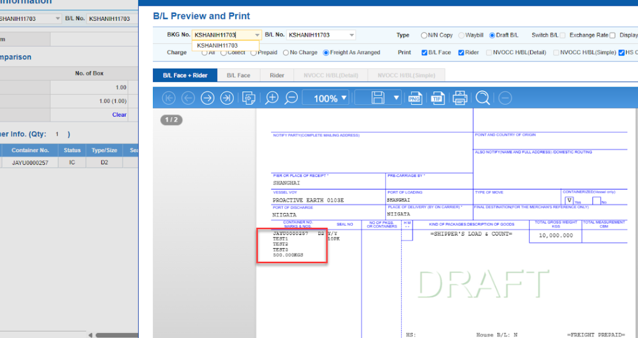 Printにチェックを設定した入力したコンテナ番号はB/L上に全て表示されます。